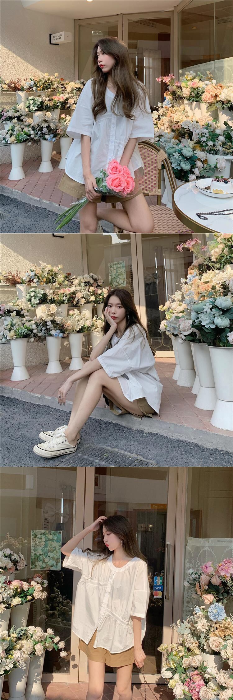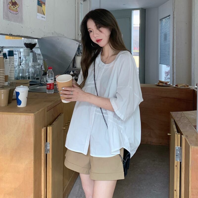 色:ホワイトラウンドネックシャツ,ホワイトラペルシャツ,アプリコットパンツ,カーキ色のズボン