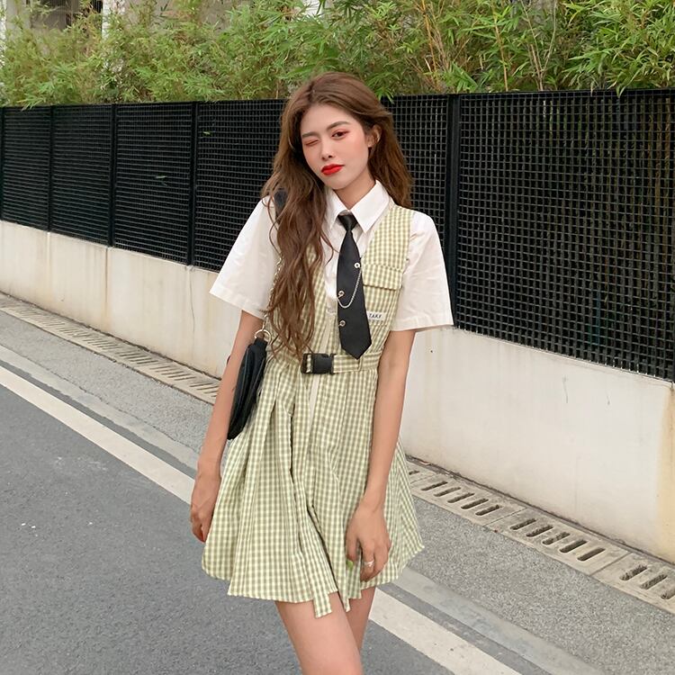 色:ブラックストラップドレス,サスペンダースカートをチェック,シャツ+ネクタイ