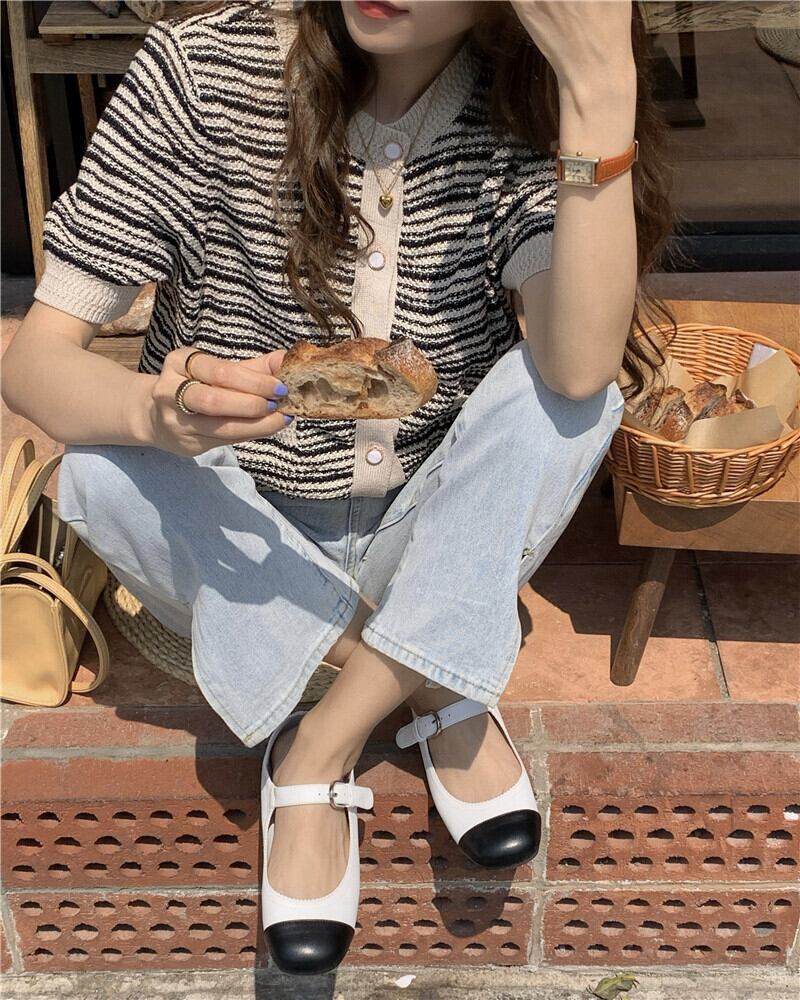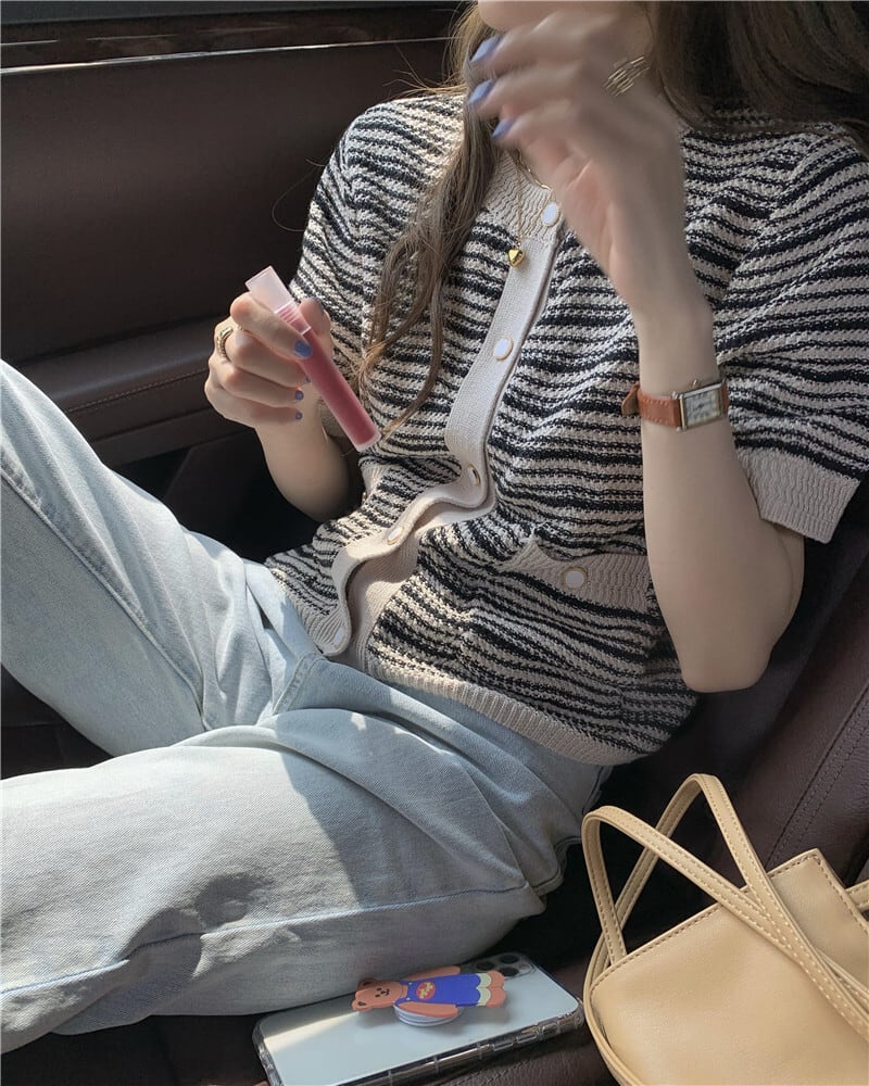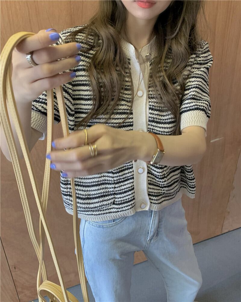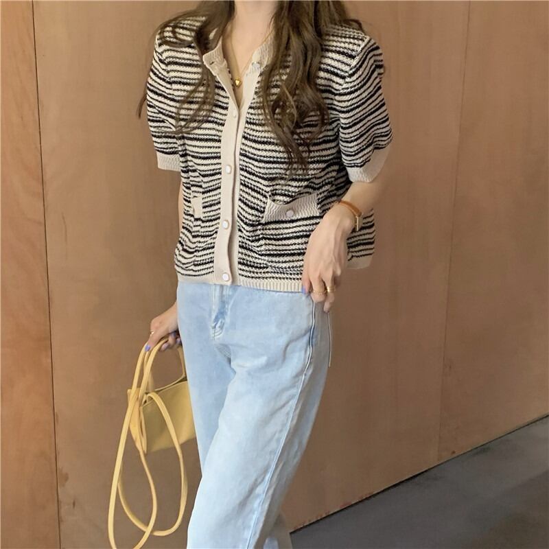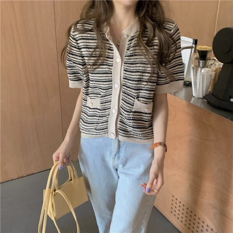 スタンダードストライプショートニットセーター レディース夏服カーディガン韓国ファッションスタイルトップス レトロ 夏物 DOLL83716233060