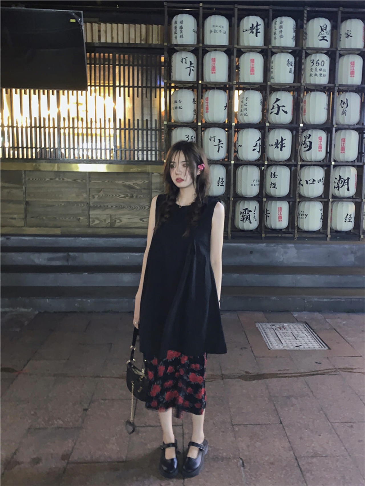 色:サスペンダーのバラ,ノースリーブaラインスカートブラック