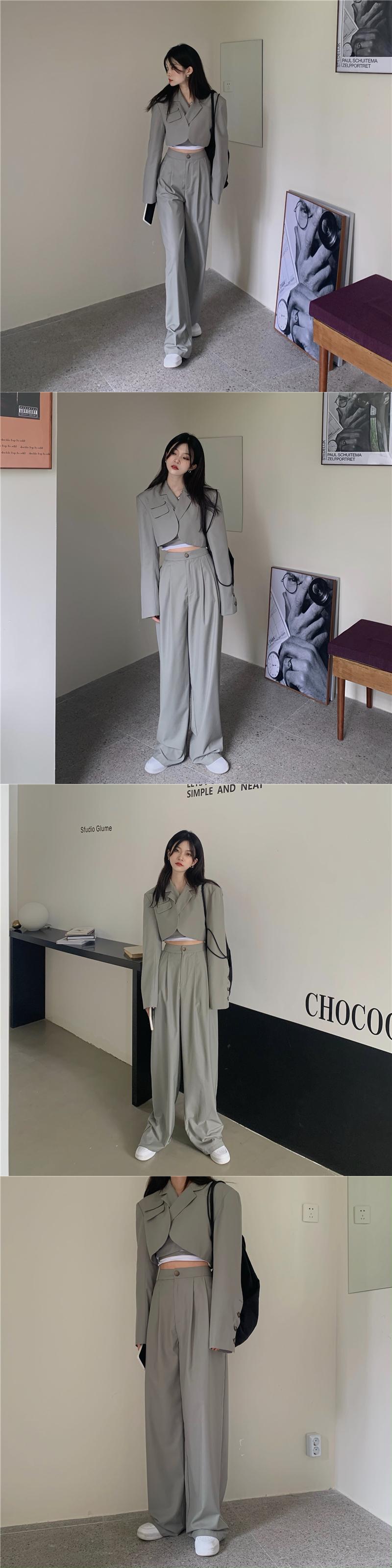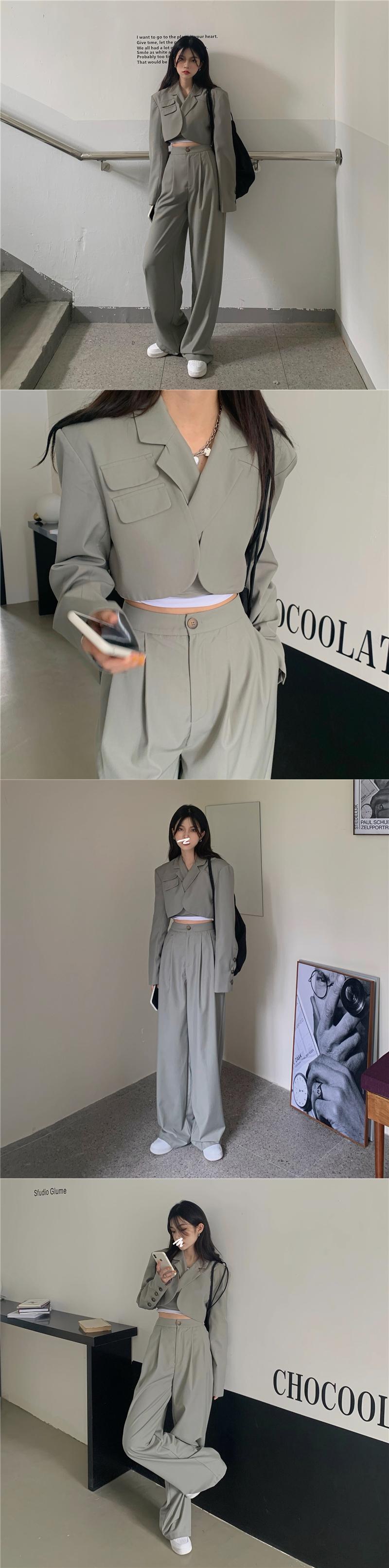 色:黒のスーツトップ,黒のスーツパンツ,グレーグリーンスーツトップ,グレーグリーンのスーツパンツ