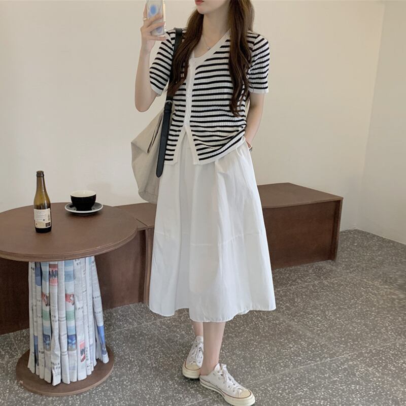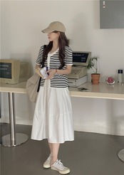 色:白いスカート,ストライプトップ