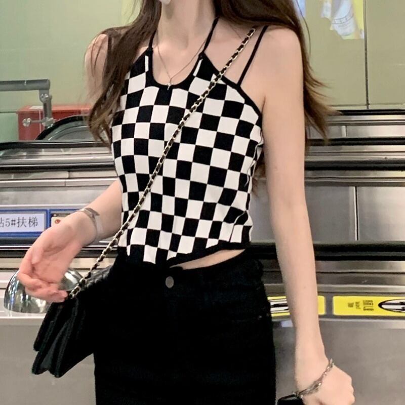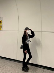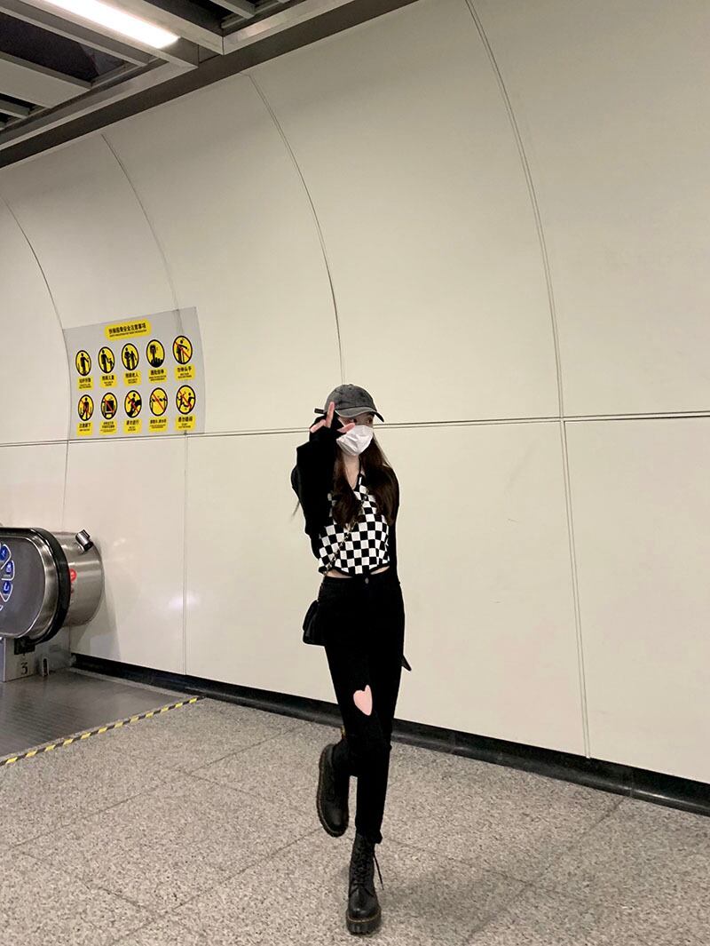 色:ブラックカーディガンセーター,黒のペンシルパンツ,チェック柄ベスト