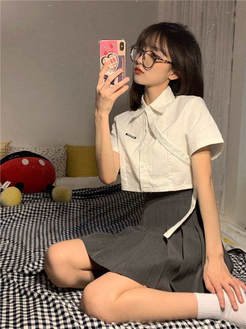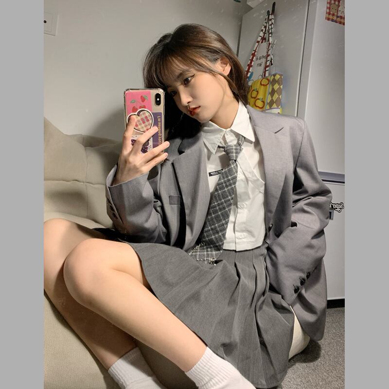色:半袖シャツ,長袖シャツ,グレーのスーツ,プリーツスカート,チェーンネクタイ