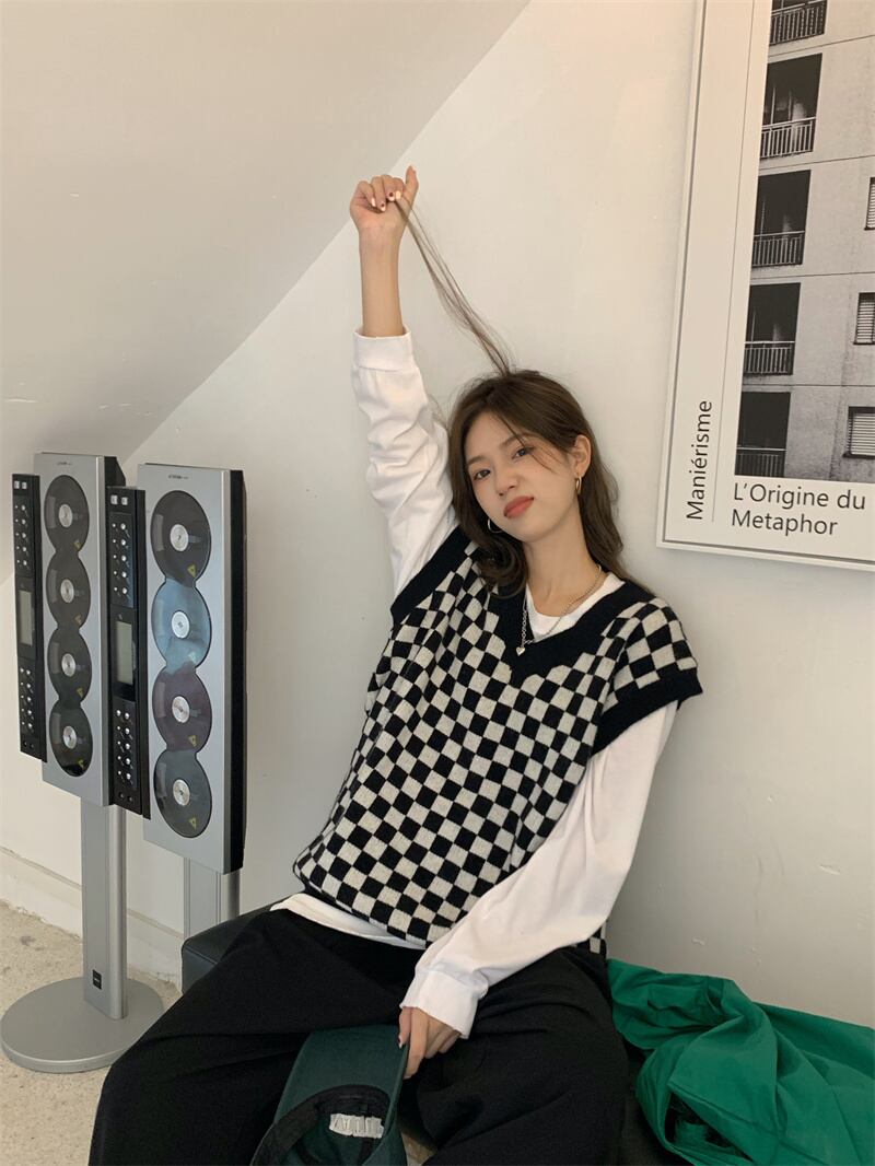 色:白いTシャツ,チェッカーボードベスト