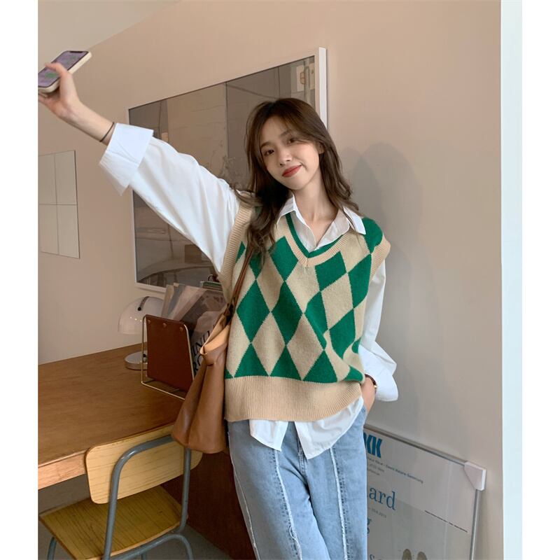 色:白のシャツ,グリーンベスト,ネイビーブルーベスト