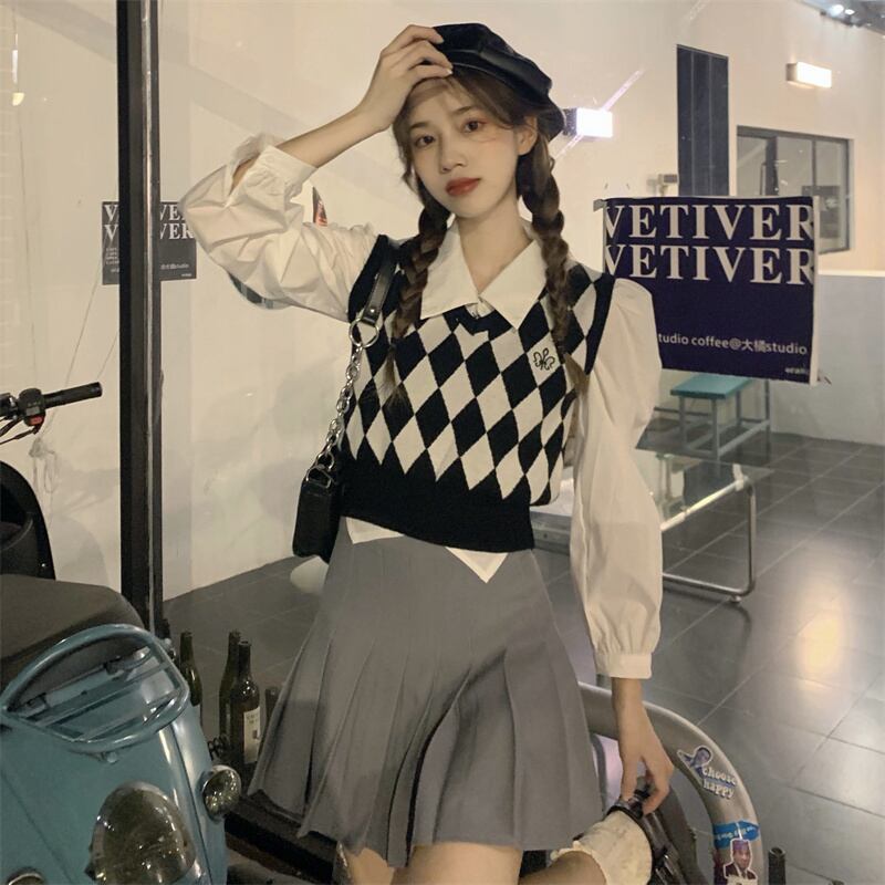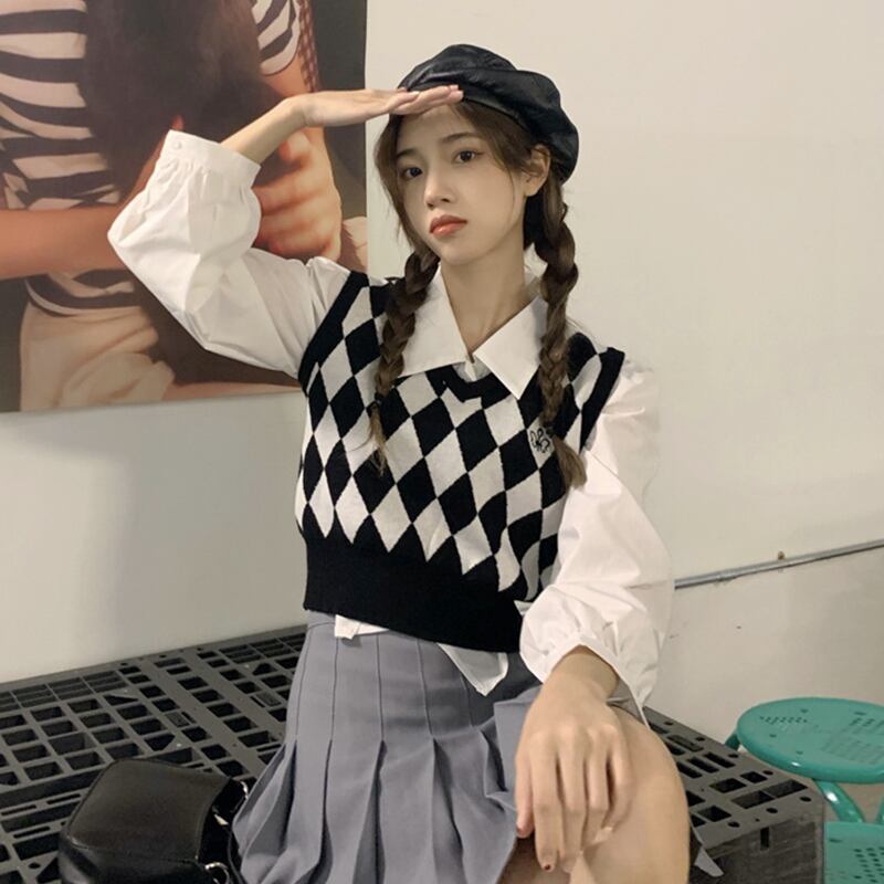 色:白のシャツ,ひし形のベスト,ダイヤモンドカーディガン