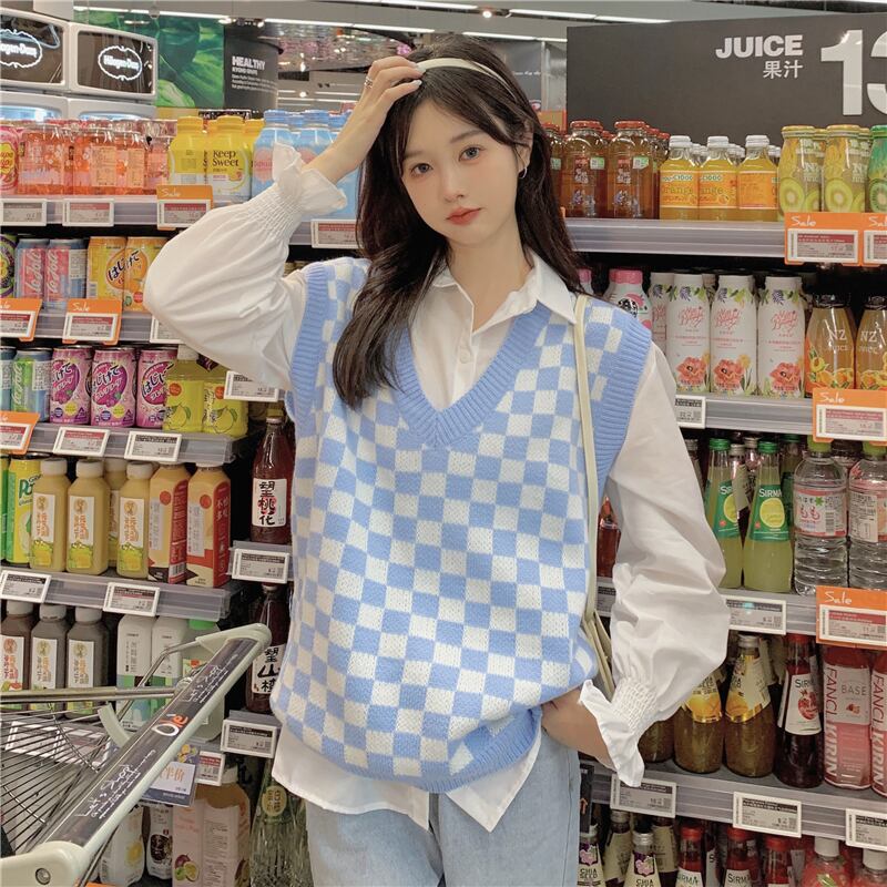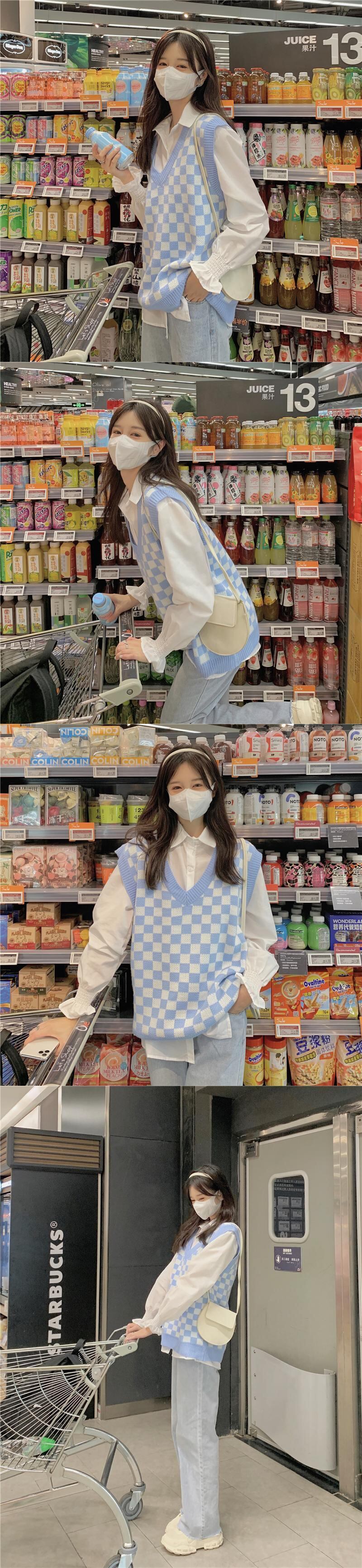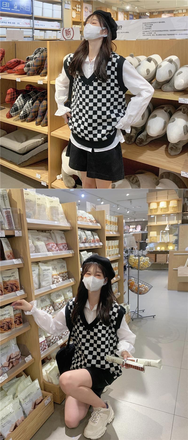 色:白いシャツのワンピース,黒と白のベスト,ブルーチェックベスト