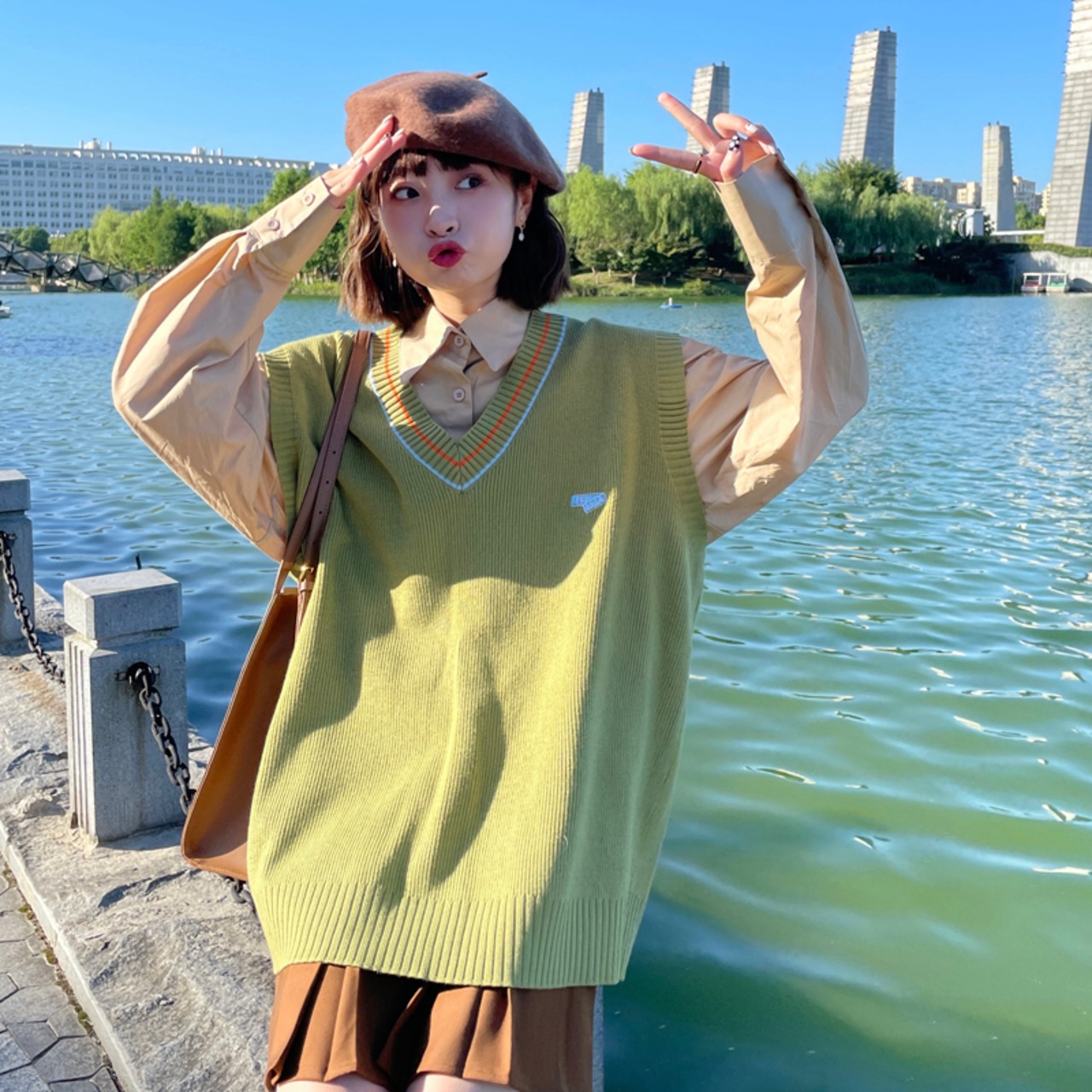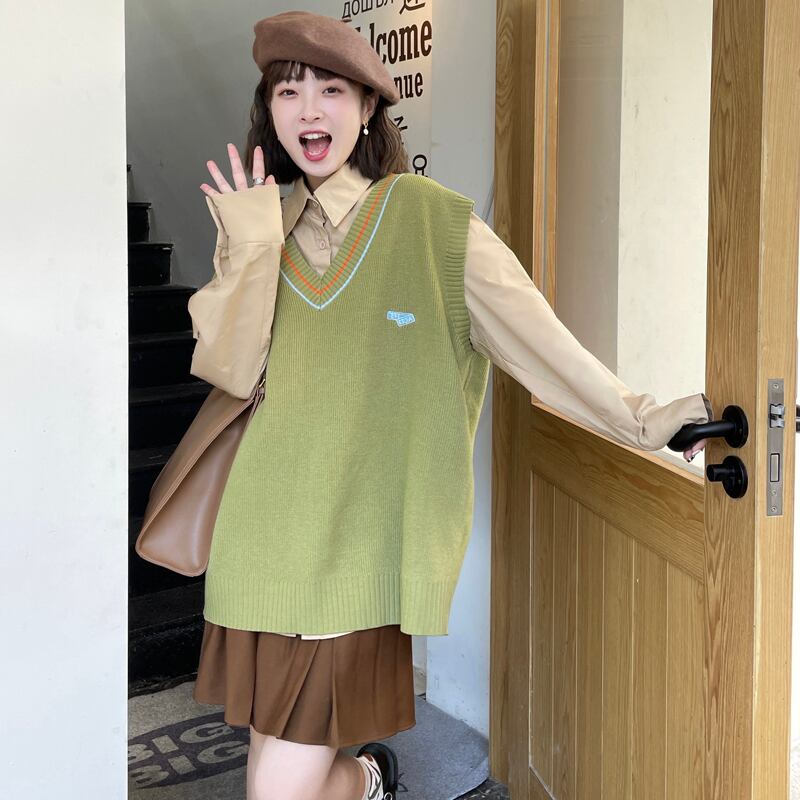 色:グリーンベスト,カーキ色のシャツ