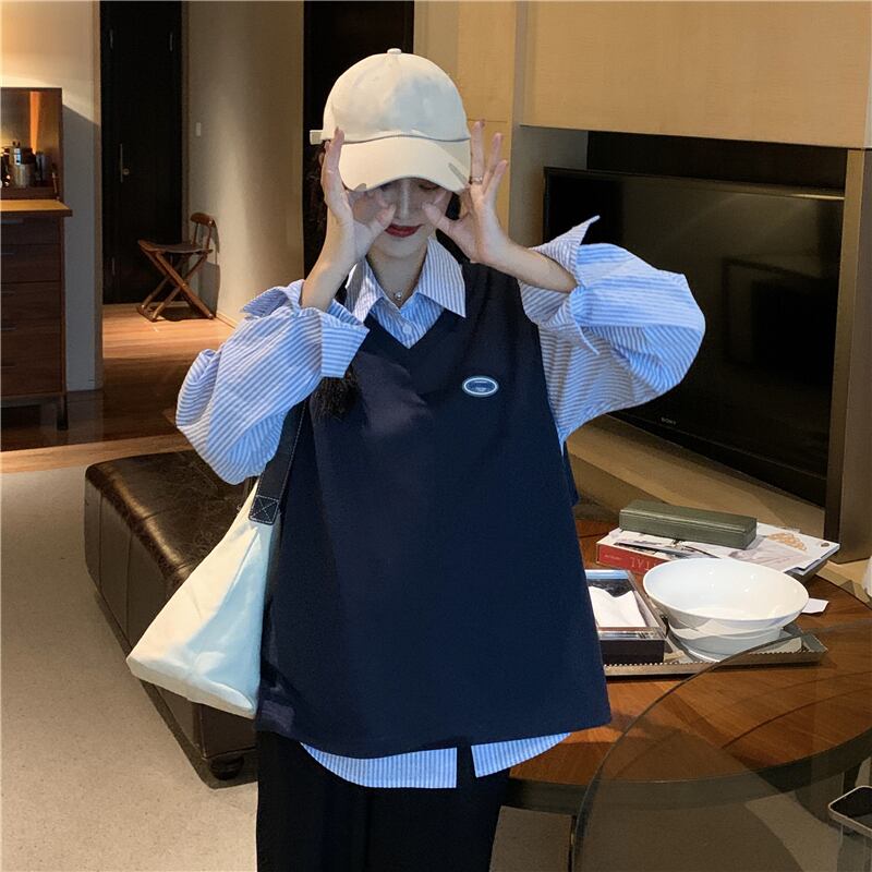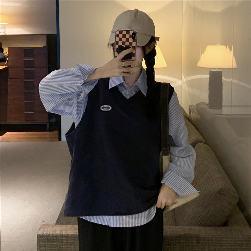 色:ネイビーブルーベスト,ストライプシャツ