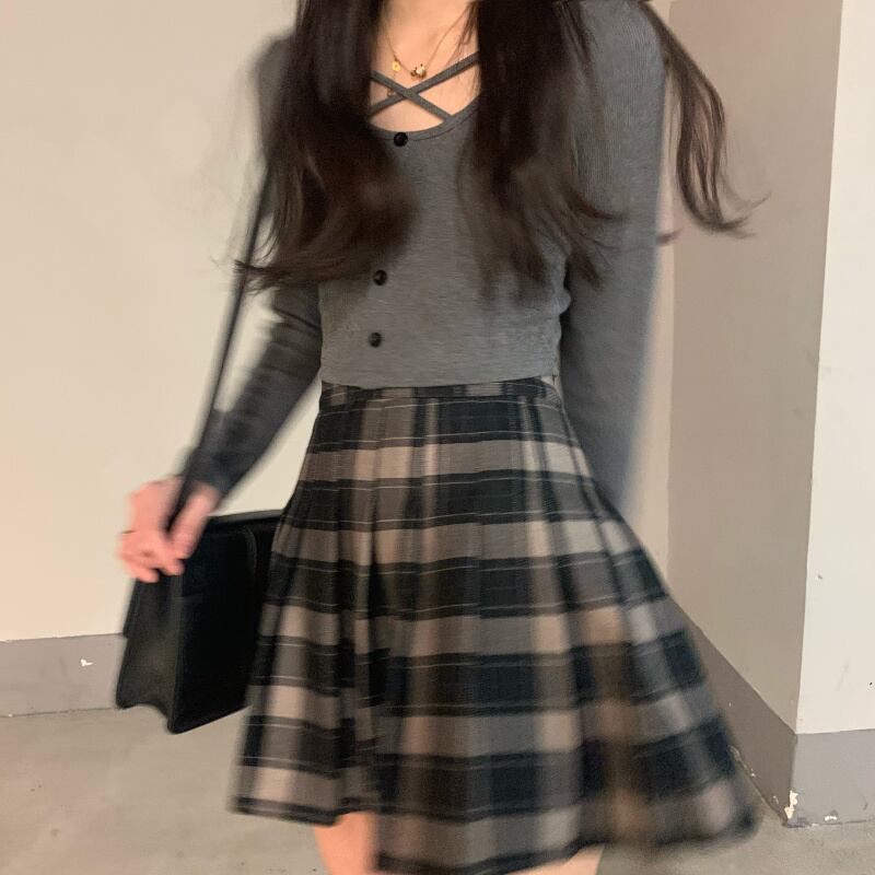 色:ブラックトップ,ダークグレートップ,チェック柄プリーツスカート