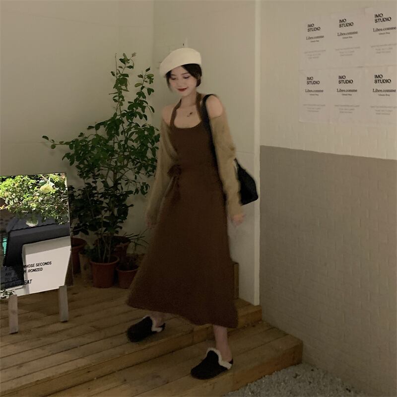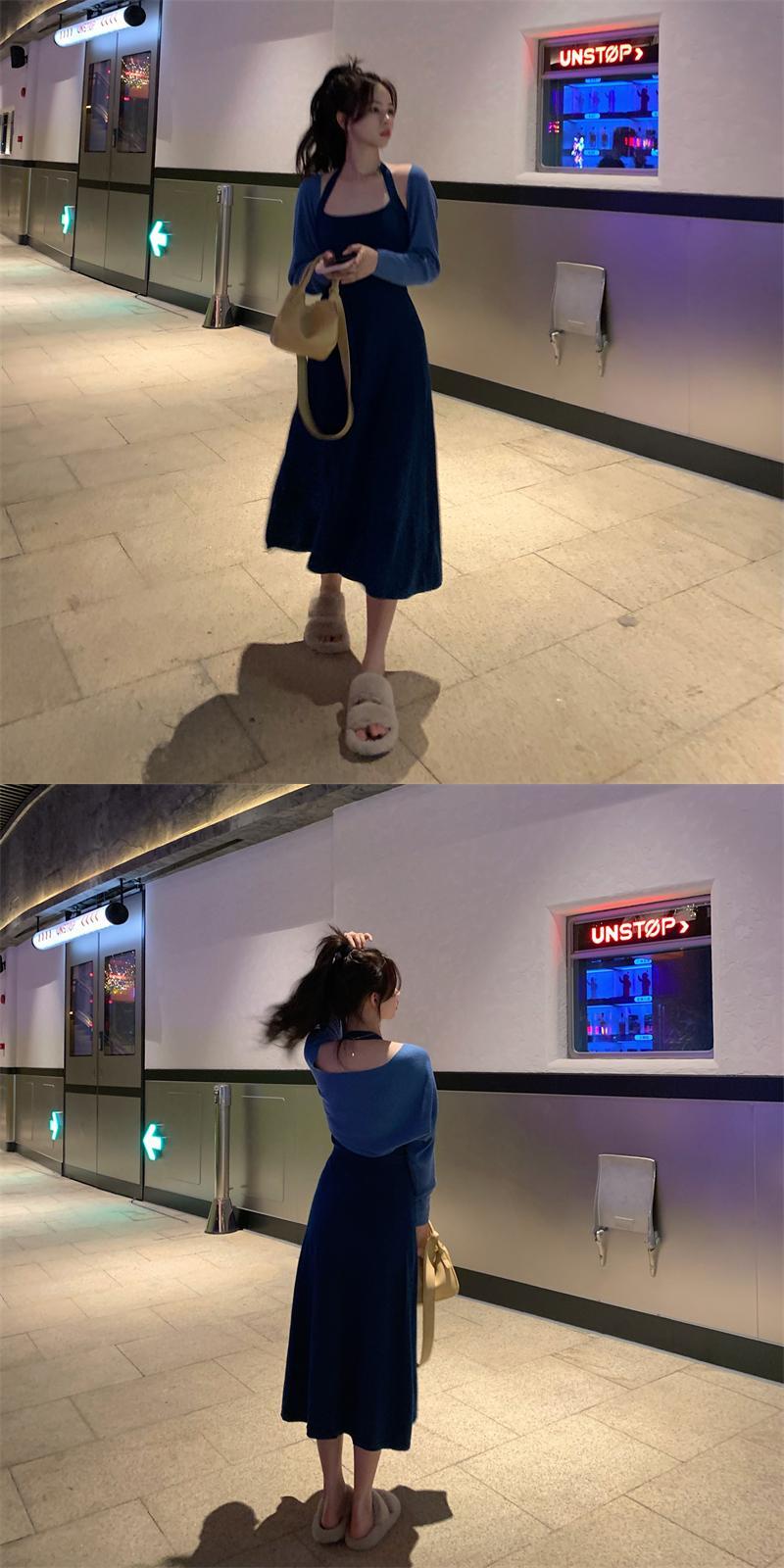 色:青いスカートと青いカーディガン,コーヒースカートとカーキカーディガン
