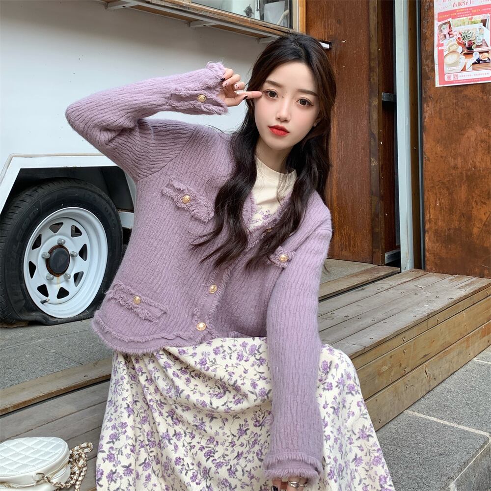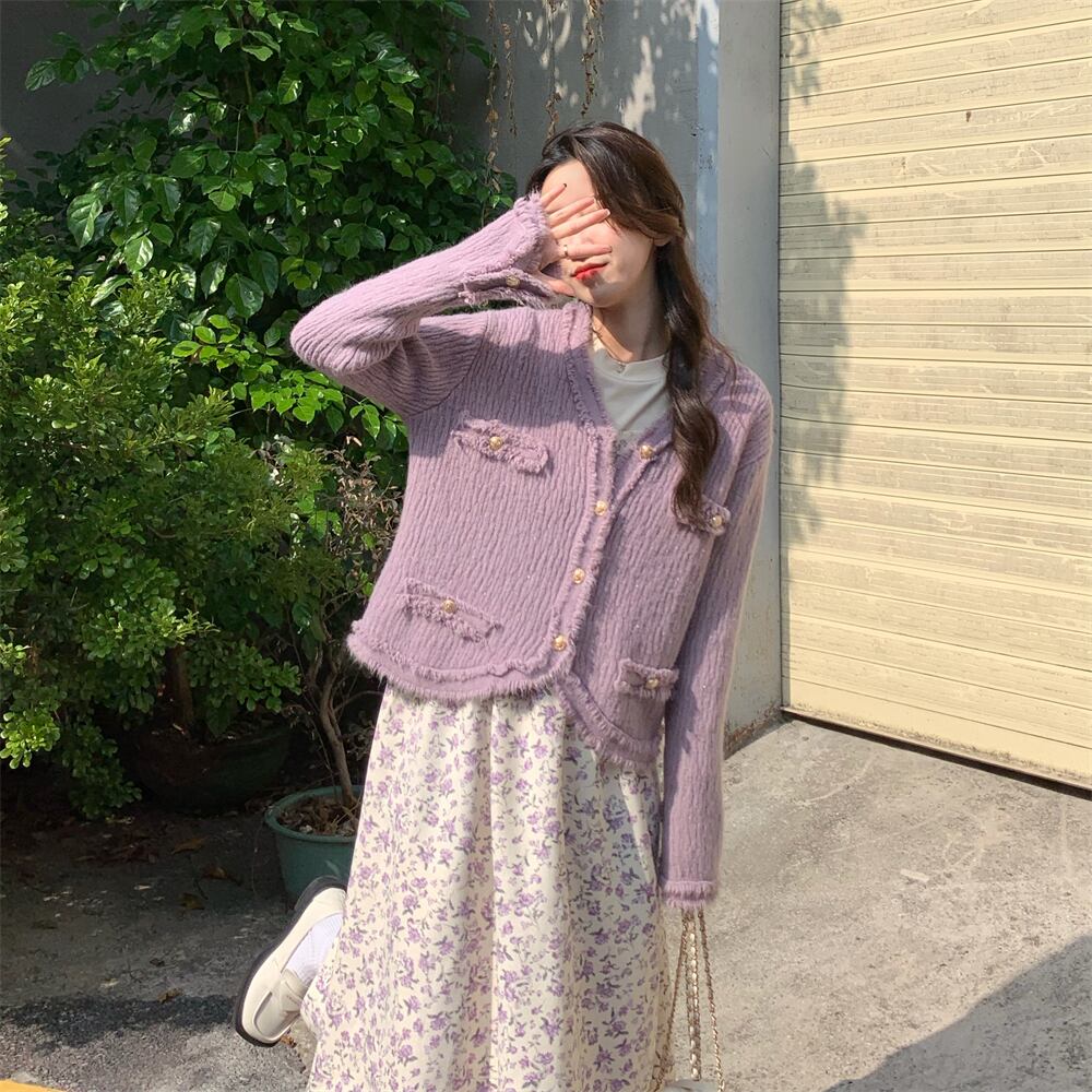色:パープルカーディガンセーター,パープルフローラルスカート