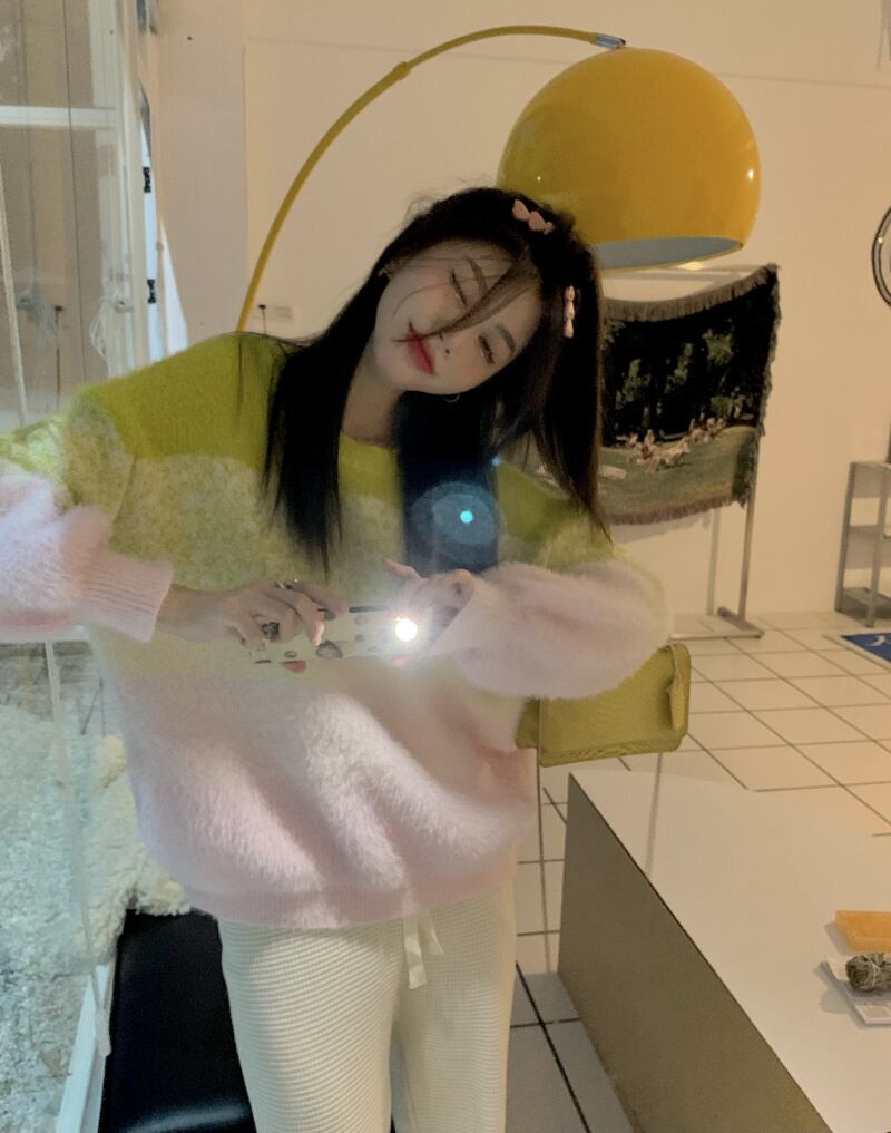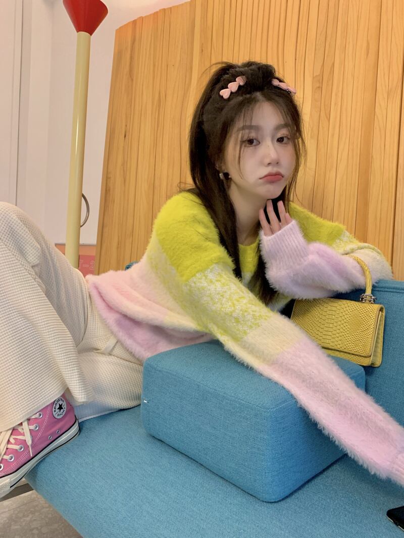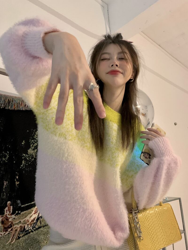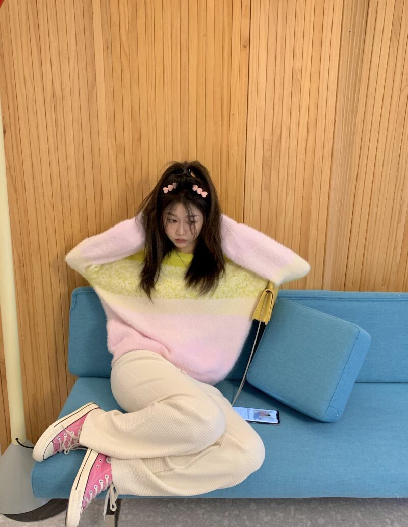 色:グラデーションセーター,乳白色のおばあちゃんパンツ