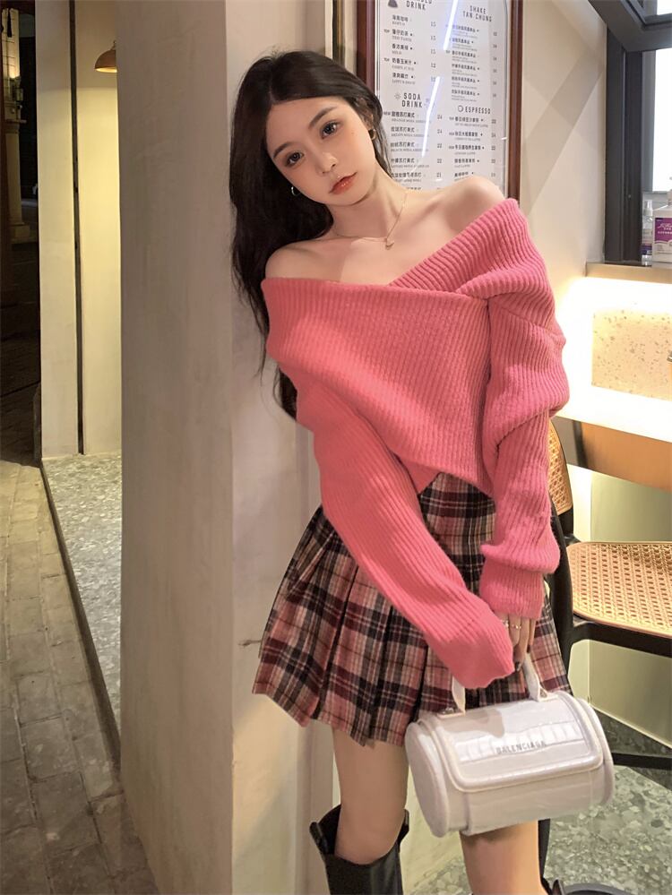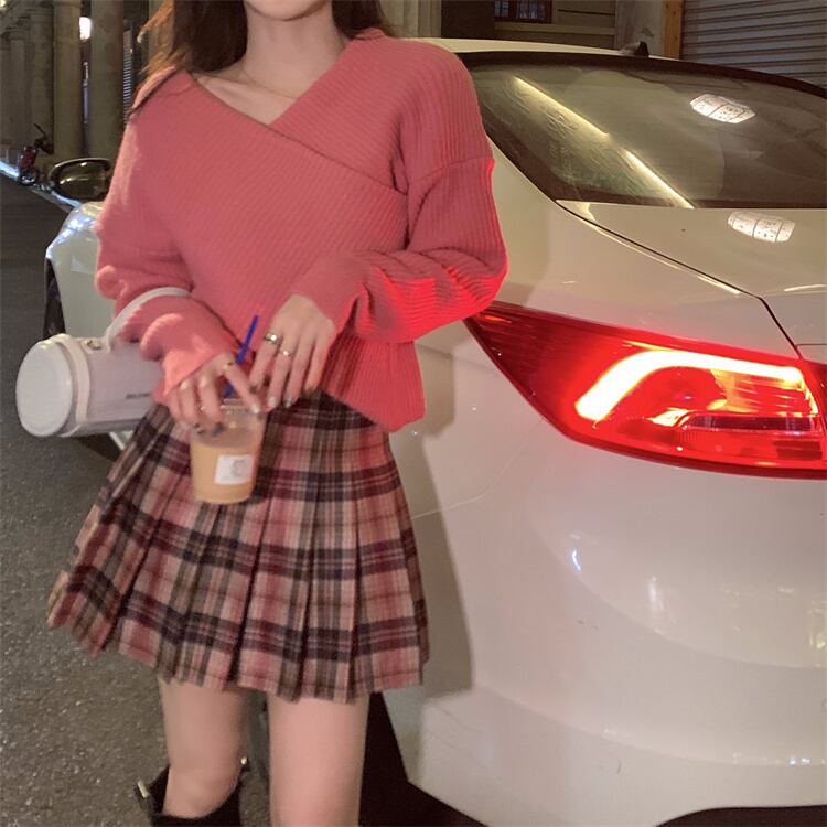 色:ピンクのセーター,黒いセーター,ハイグスカート,ピンクチェックスカート