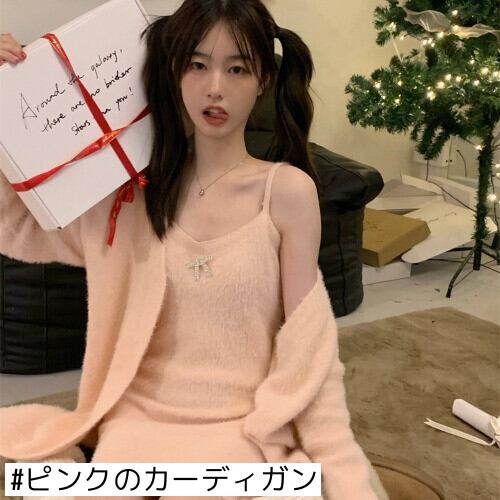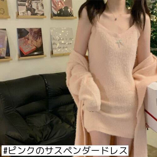 色:白いカーディガン,ブラックカーディガン,ブラックサスペンダースカート,ピンクのサスペンダードレス,ピンクのカーディガン,白いドレス