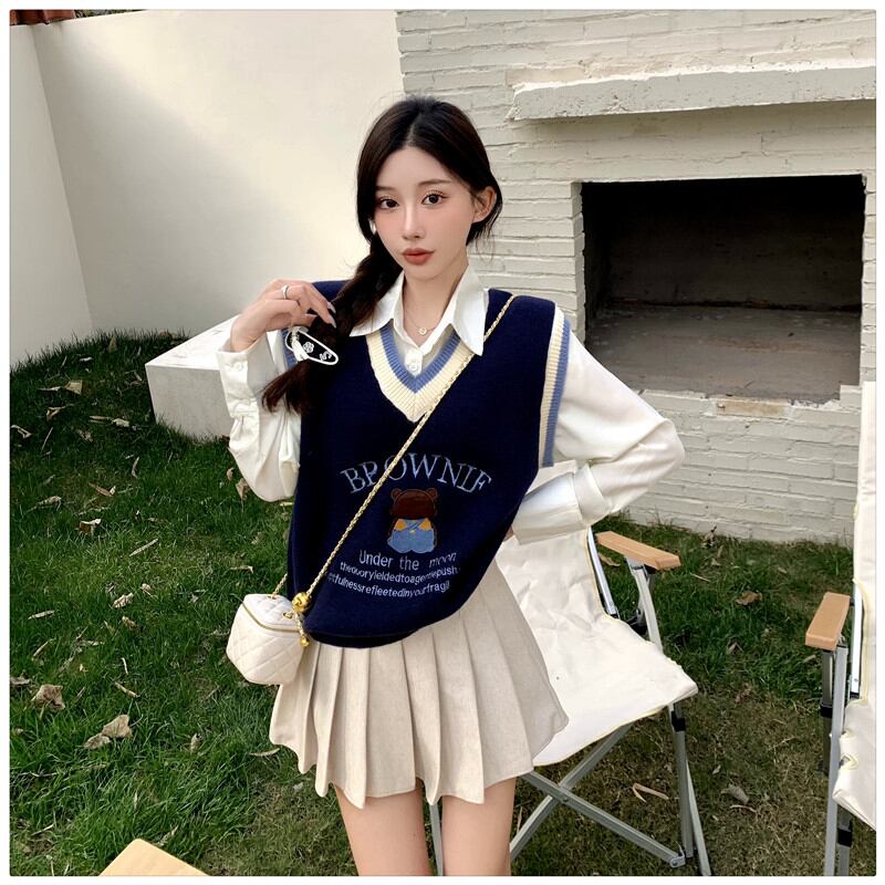 色:シャツ,プリーツスカートアプリコット,コーヒーカラーのプリーツスカート,ベストアプリコット,ベストブルー