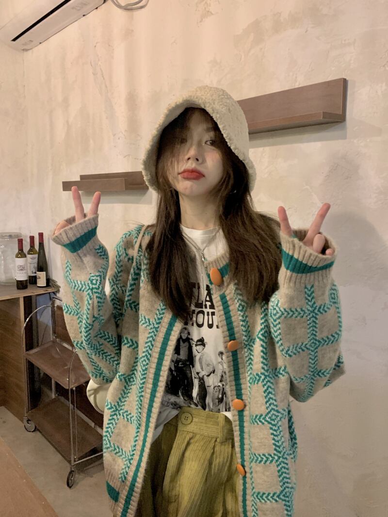 色:コーデュロイパンツ,緑と灰色のセーター