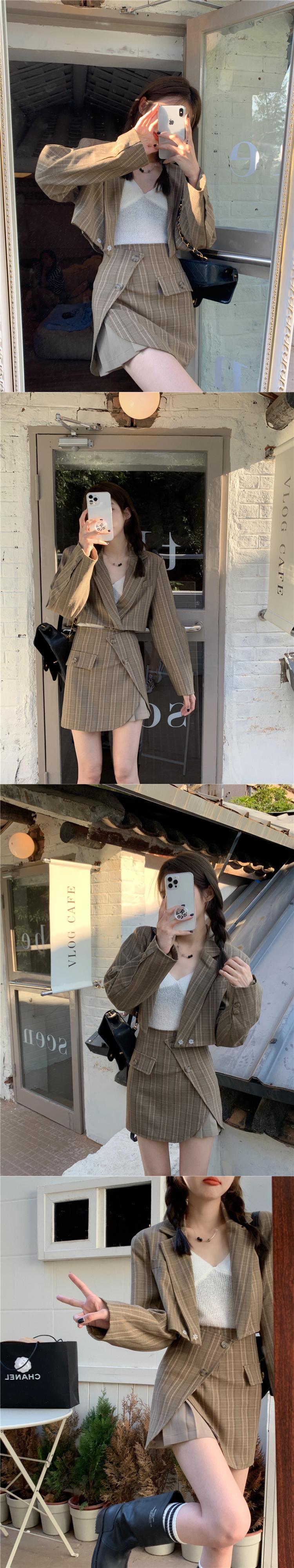 色:格子縞のスーツ,チェック柄スカート,ニットサスペンダー