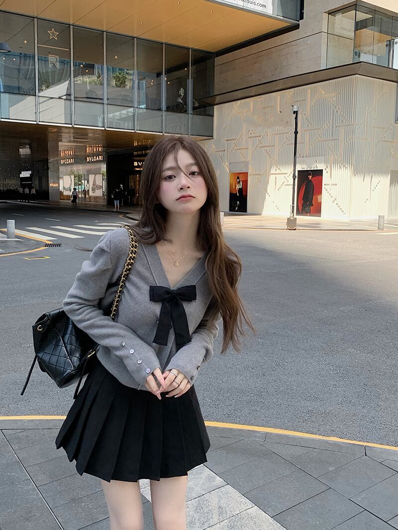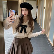 色:アプリコットセーター,グレーのセーター,コーヒーカラーのプリーツスカート,ブラックプリーツスカート