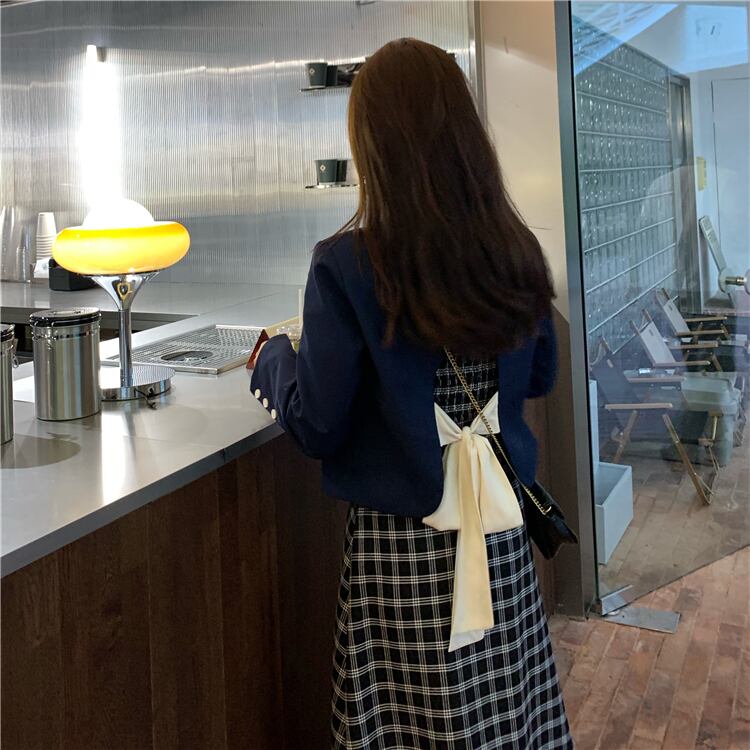 色:紺のスーツ,カーキ色のスーツ,黒と白のグリッドドレス,ブラックサスペンダースカート