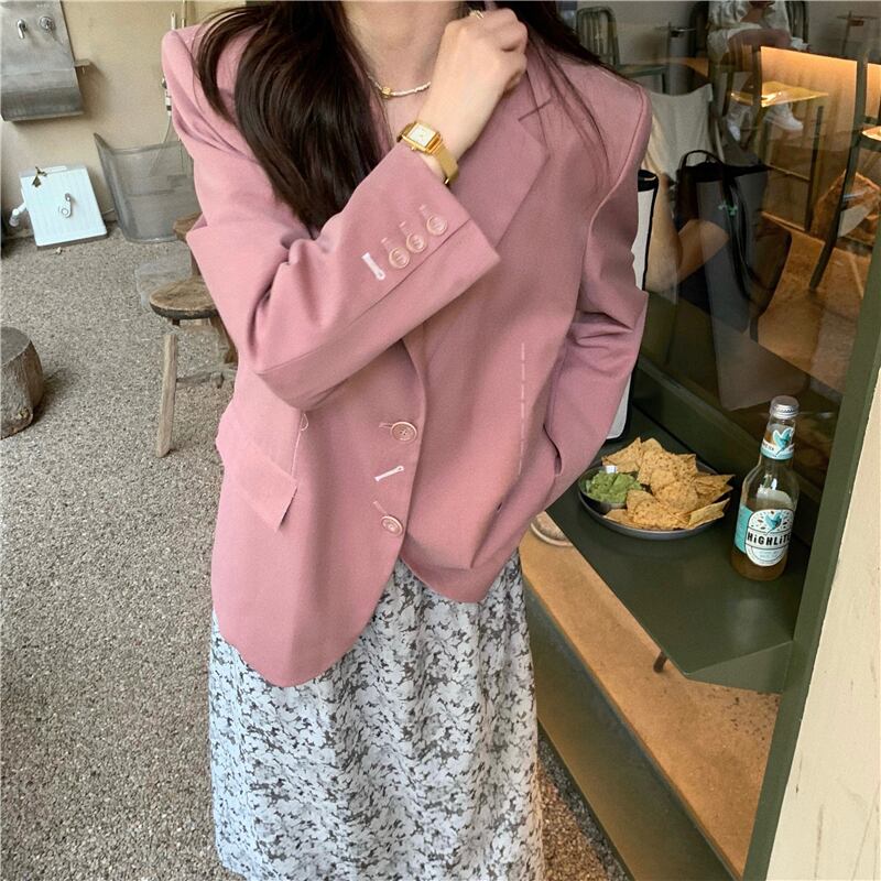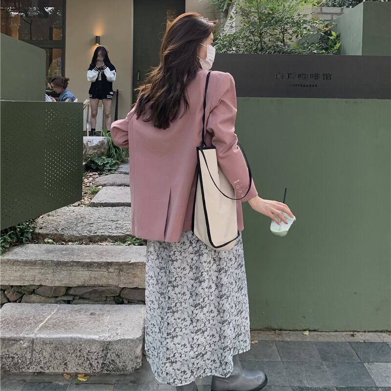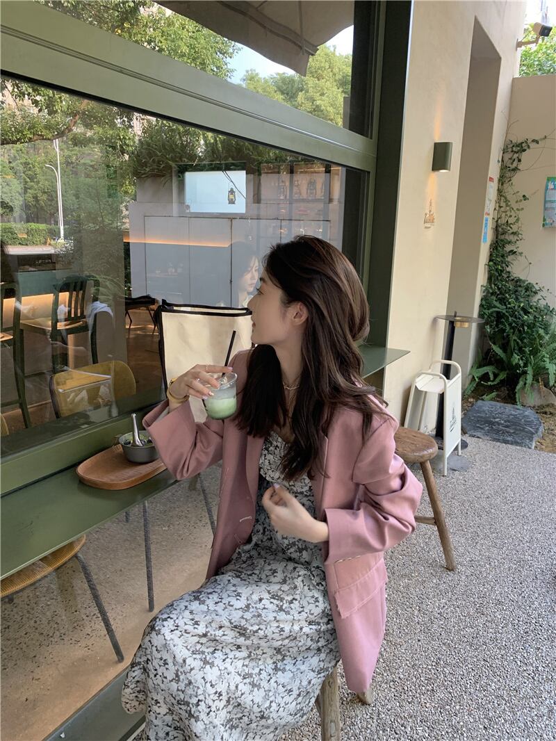 色:インクグレーのチューブトップドレス,ローズピンクのブレザー