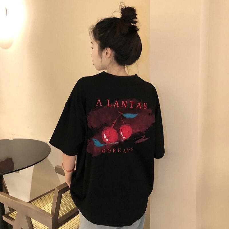 色:ホワイトバックチェリーTシャツ,ブラックチェリーバックTシャツ,ホワイトバックピーチ,ブラックバックピーチ,白い背中に水彩のイチゴ,黒の背中に水彩のイチゴ