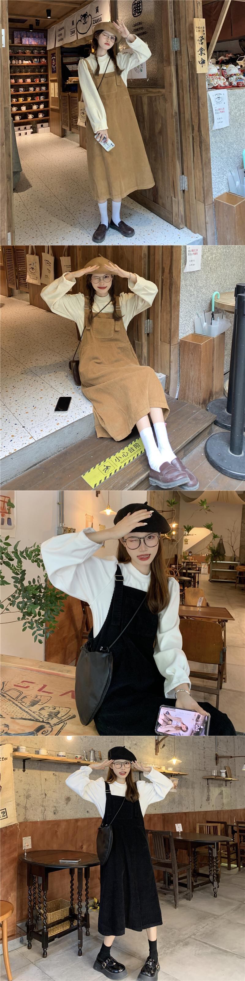 色:ライトカーキストラップドレス,ダークブラウンのサスペンダースカート,ブラックストラップドレス,ホワイトボトミングシャツ,アプリコットボトムスシャツ