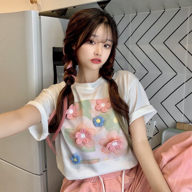 ホワイトFlowerデザイン Tシャツ夏服韓国ファッションルーズトップス 大人ガーリー スウィート キュート カジュアル 夏物 フラワーデザイン スタイル DOLL23015325061 | pleglad Dorothy