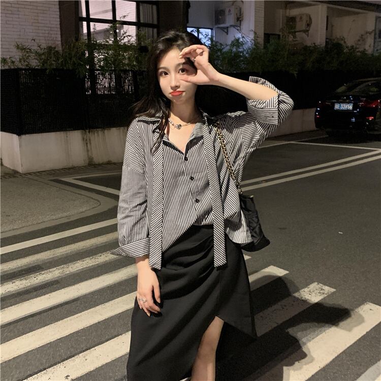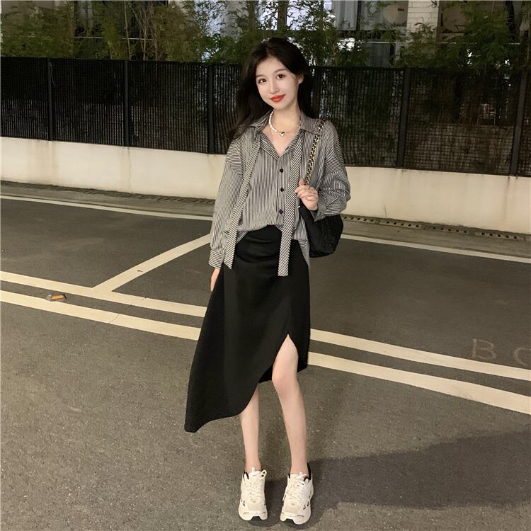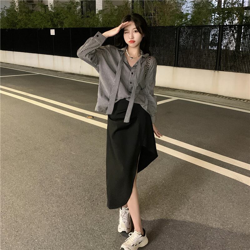 色:ストライプシャツ,黒スカート