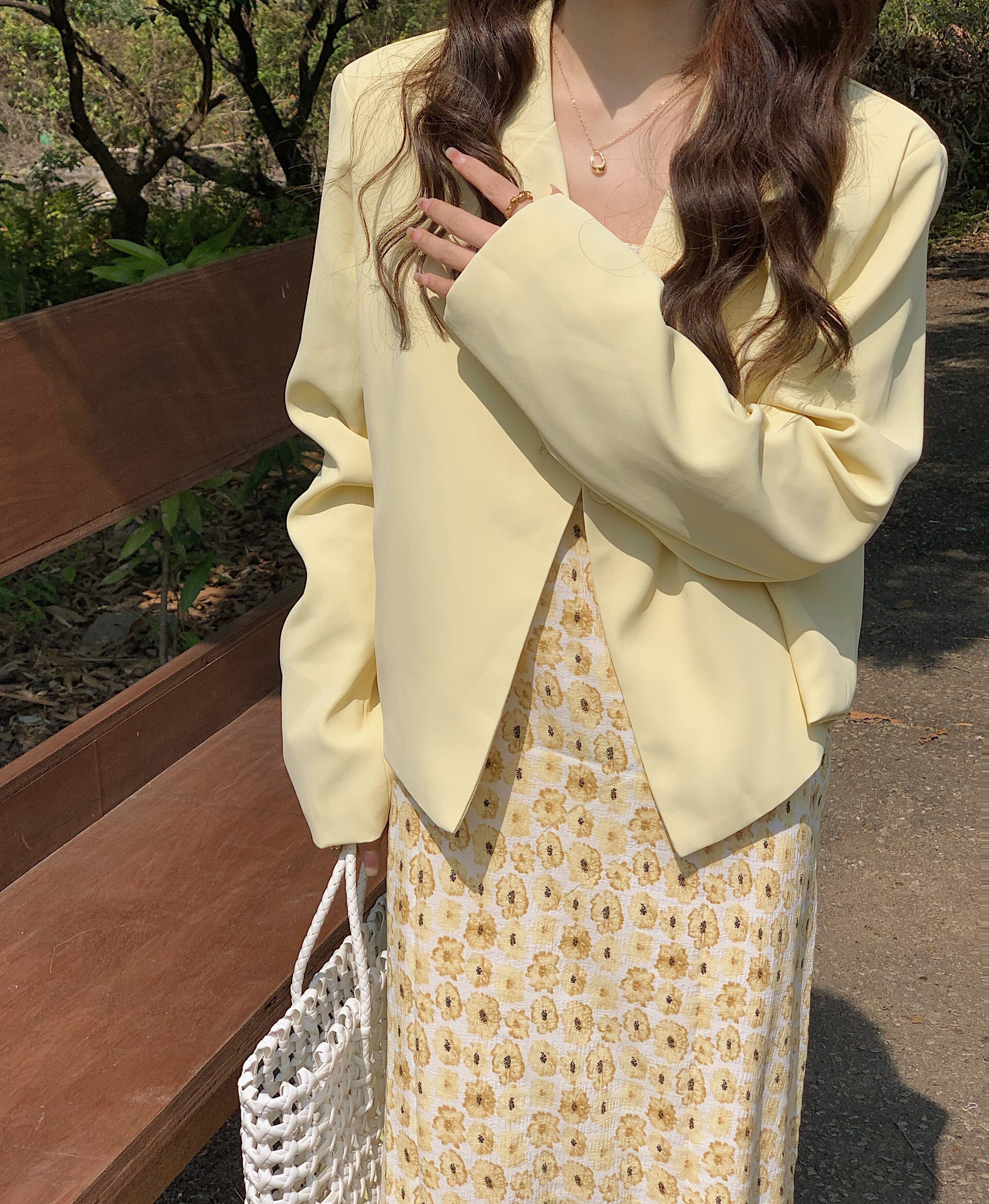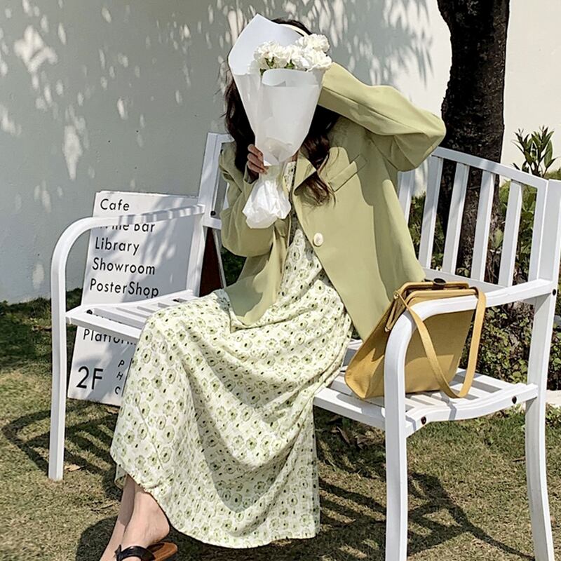 色:緑のドレス,黄色のサスペンダースカート,緑のブレザー,イエロースーツジャケット