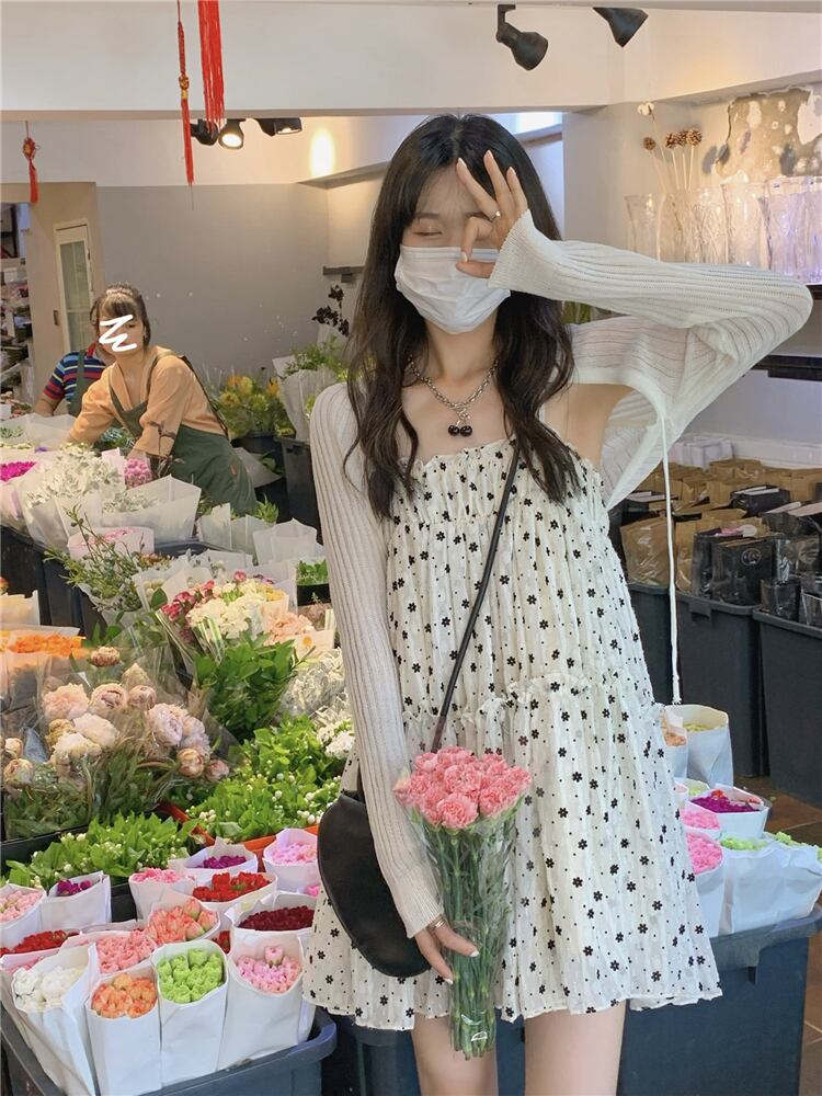 色:白いカーディガン,リトルフラワーフラワーサスペンダースカート